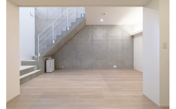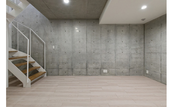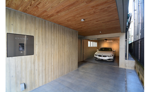 都内では希少なコンクリート打ち放し仕上げのワークスペース兼ガレージ。杉板型枠コンクリート壁と天然木の軒天井が映えるシャープな中にも温かみを感じるデザインです。
