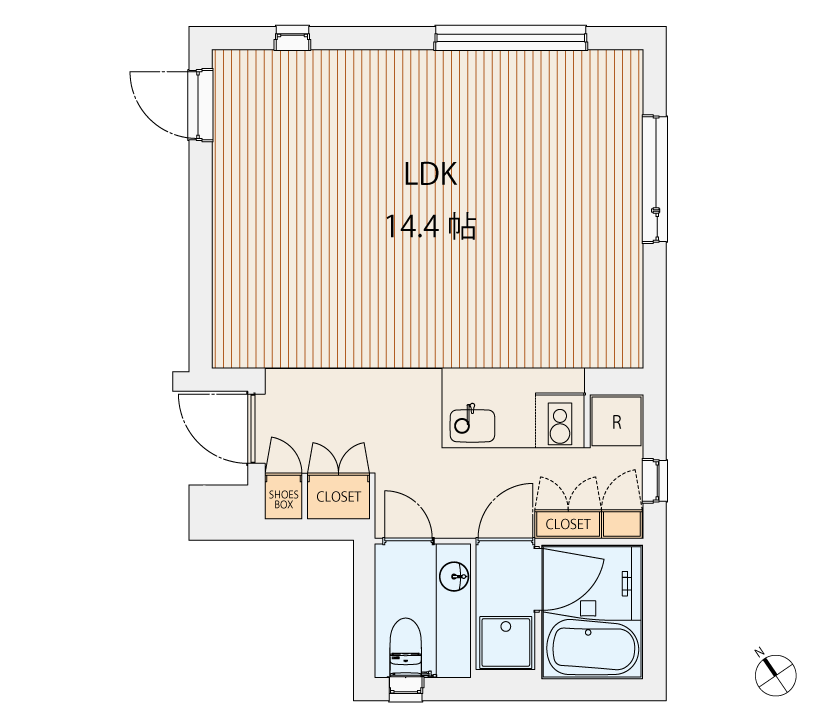 広い1Rタイプなので家具の配置によって自由に間仕切ることができ、どんなライフスタイルにも心地よくフィットします。 401号室は一部天井が高く、立体感のある空間です。